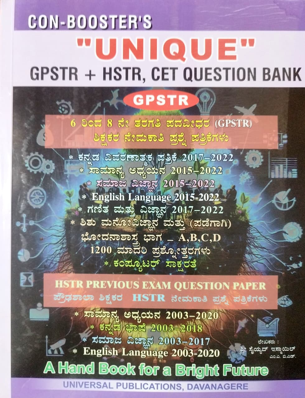 | Book name | Unique GPSTR + HSTR & CET Question Bank | ಹಿಂದಿನ ಪ್ರಶ್ನೆ ಪತ್ರಿಕೆಗಳ ಸಂಗ್ರಹ (Previous Year Papers) | Universal Publications |
