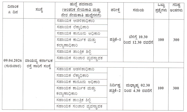 ಕರ್ನಾಟಕ ಪರೀಕ್ಷಾ ಪ್ರಾಧಿಕಾರವು (KEA) ವಾಯವ್ಯ ಕರ್ನಾಟಕ ರಸ್ತೆ ಸಾರಿಗೆ ಸಂಸ್ಥೆಯಲ್ಲಿನ (NWKRTC) ವಿವಿಧ ವೃಂದಗಳ ದರ್ಜೆ-2 ಅಧಿಕಾರಿ ಹುದ್ದೆಗಳ ನೇಮಕಾತಿಗೆ ಸ್ಪರ್ಧಾತ್ಮಕ ಪರೀಕ್ಷೆಯ ಅಧಿಕೃತ ವೇಳಾಪಟ್ಟಿಯನ್ನು ಮಾರ್ಚ್ 07, 2026 ರಂದು ಬಿಡುಗಡೆ ಮಾಡಿದೆ. ಸರ್ಕಾರಿ ಉದ್ಯೋಗದ ನಿರೀಕ್ಷೆಯಲ್ಲಿದ್ದ ಅಭ್ಯರ್ಥಿಗಳಿಗೆ ಇದೊಂದು ಪ್ರಮುಖ ಅಪ್ಡೇಟ್ ಆಗಿದ್ದು, ಪರೀಕ್ಷಾ ಸಿದ್ಧತೆಯನ್ನು ಚುರುಕುಗೊಳಿಸುವ ಸಮಯ ಬಂದಿದೆ.