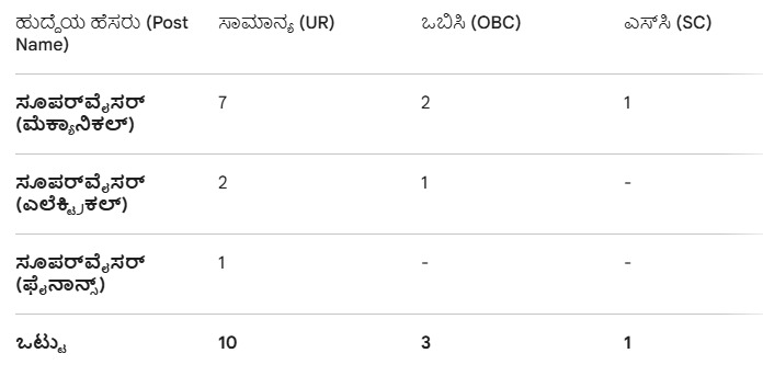 ಸೂಪರ್ವೈಸರ್ (ಎಲೆಕ್ಟ್ರಿಕಲ್): ಎಲೆಕ್ಟ್ರಿಕಲ್ ಅಥವಾ ಎಲೆಕ್ಟ್ರಾನಿಕ್ಸ್ ಎಂಜಿನಿಯರಿಂಗ್ನಲ್ಲಿ 3 ವರ್ಷದ ಡಿಪ್ಲೊಮಾ ಪೂರೈಸಿರಬೇಕು ಮತ್ತು ಕನಿಷ್ಠ 7 ವರ್ಷಗಳ ಅನುಭವ ಹೊಂದಿರಬೇಕು (ಕೊನೆಯ 2 ವರ್ಷ ಸೂಪರ್ವೈಸರ್ ಆಗಿರಬೇಕು).
